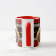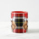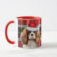 Este adorável Cavalier King Charles Spaniel veste um chapéu festivo de Papai Noel e se senta contra uma xadrez vermelha e verde de feriado para uma divertida amante de caneca de férias e mães de panela com amor.