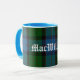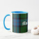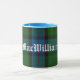 Caneca de clã escocesa com aparência de excelente feita com o padrão clássico de xadrez azul, verde, vermelha e preto MacWilliam. O texto no estilo do mundo antigo em branco lê MacWilliam e é personalizável para ler o que você quer.