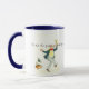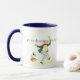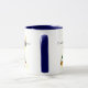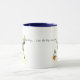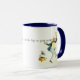 Uma caneca de café branca com uma pega e jante azul escura e uma ilustração "Jovem no Coração" esbranquiçada, para trás e para a frente. A citação é de Abraham Lincoln.