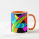 O ò de 4 bonitos, canecas coloridas. O design é um abstrato dos corações, dos arcos-íris, dos pontos e de mais em brilhantes, cores do divertimento em um painel preto. O punho e o interior são alaranjados.