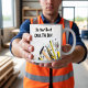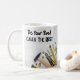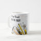 Canecas de café masculinas engraçadas com um tema de humor de construção civil e clichês, juntamente com ferramentas manuais ao fundo.