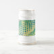 A pintura em forma de diamante abstrato de forma azul, verde e roxa, em um fundo amarelo, é impressa em canecas de cerveja.
