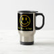 enfrente as canecas de viagem com a cara feliz amarela no fundo preto. O grande design para temas relacionou-se à felicidade, à alegria, à celebração, ou à inspiração. Use estes como as canecas de viagem, como um grande presente do dia dos pais ou o presente do dia das mães.