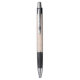 A ballpoint pen with a black cap and tip. The barrel has a light, textured pattern. The pen is displayed horizontally, showcasing both front and bottom views.