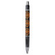 Esta caneta incrível apresenta um oval laranja com seis corvos. Cada corvo tem olhos amarelos com pupilas pretas e asas salientes. Os corvos voam em direção uns aos outros formando uma forma oval. O fundo é preto.
