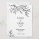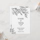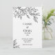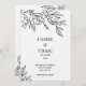 Um convite de casamento minimalista que inclui uma ilustração feita por uma linha desenhada à mão de um rosa floral com folhas pequenas, a tinta preta contra um fundo branco puro num papel de convite importado, de textura macia e luxuosa. Outros papéis de impressão mais econômicos estão disponíveis de acabamento mate a brilhante.