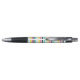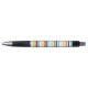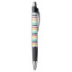 A caneta apresenta um design vibrante e atraente para os olhos com listras em várias cores, incluindo rosa, verde, amarelo e preto. A combinação dessas cores cria uma estética alegre e enérgica. As faixas são colocadas sobre um fundo branco, fornecendo um contraste impressionante.