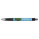 Você pode personalizar esta caneta de lembrança de família azul com o nome da sua família, a data da reunião e a localização. O texto é branco. Uma árvore está ao lado do texto.