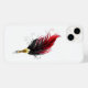 Caneta antiquada artisticamente desenhada e decorada com pena vermelha escura em fundo branco.
