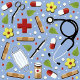 Design de caneta com temas médicos exclusivos que inclui suprimentos de saúde em um fundo azul. Para personalizar o texto de edição para adicionar o nome do médico.