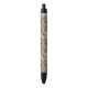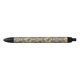 Esta caneta tem corvos, libélulas e besouros cercados por flores e folhas em tons de massa e cinza em um fundo bronzeado.