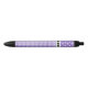 Caneta de tinta com xadrez roxa e bolinhas brancas giras em roxo com uma fita fofa de corações pretos.