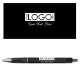 Design de caneta comercial simples e na moda com fundo preto o seu logotipo de negócios personalizado e o texto do script personalizado do estilo retrô. Personalize os detalhes e torne-os seus. Um design ideal para promoções de negócios, artigos de papelaria para funcionários, presentes para clientes, marketing de negócios e publicidade.
