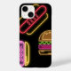 .: Dois cachorros-quentes neonônios e um hambúrguer sobre fundo preto contrastante: Diversão de design por 7 Anos de Idade
