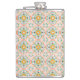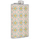 A metal flask with a colorful, symmetrical pattern of floral motifs in blue, orange, and yellow on a pale pink background, conveying a vintage, playful tone.