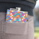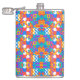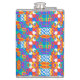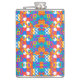 A vibrant flask featuring a colorful geometric pattern with shapes like flowers and squares in red, blue, yellow, and green, creating a lively and playful design.