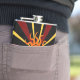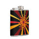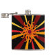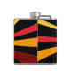 Este frasco decorativo de quadril apresenta um padrão geométrico abstrato do sol e são raios em cores vermelho, amarelo, dourado, laranja e marrom sobre fundo preto puro.
