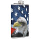 Este frasco patriótico é adornado com uma foto de uma águia careca em frente à bandeira americana.