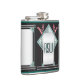 Este frasco personalizado da anca coordena com a Série Casada "Pussy Willow" da "Art Deco Pink" da "MarryType", a frente apresenta um retângulo prateado centrado adornado, com vidro com chumbo aqua, moldagem de pedra turquesa, salgueiros rosa alto e bares de suporte de prata, todos colocados sobre um fundo preto. Os campos de texto personalizados para as iniciais do destinatário na frente e no verso são campos para data, uma mensagem pessoal, a saudação e o(s) nome(s) do(s) destinatário(s).