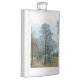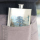 Um design de arte de outono de uma árvore de abetos e uma pessoa desfrutando de paz e tranquilidade.