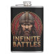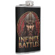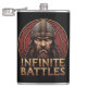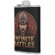 Um design ousado e dinâmico que apresenta o texto "Batalhas Infinitas" em uma paleta tradicional de cor Viking de vermelho e ouro. As palavras são dispostas em um estilo poderoso, angular, reminiscente de antigas cordas. O fundo é uma superfície texturizada, meteorizada, acrescentando um senso de autenticidade e significado histórico.
