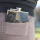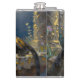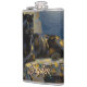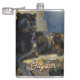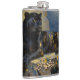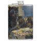 A black panther themed personalized flask. On the front is an illustration of a majestic black panther with fur like molten black and gold, laying on a cliff ledge bathed in ethereal moonlight. Intricate carvings adorn crumbling stone pillars, and bioluminescent flora casts a soft, otherworldly glow. The scene is rendered in a rich, textural oil painting style with thick, .