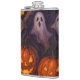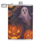 Uma ilustração vibrante do Halloween com duas lanternas brilhantes, fantasmas esquisitos flutuando numa mistura giratória de névoa roxa e laranja, e morcegos pretos soprando no fundo, criando uma atmosfera de feriado perfeita, assustadora, mas caprichosa.