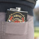 Bombeiro NOME Bombeiro Departamento de Bombeiros - Emblema com Capacete Vermelho e Machado. Personalize com seu Nome, Número da Estação/Departamento e localização.