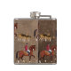 Foxperseguindo cavaleiro em seu cavalo acompanhado por galgos ao redor desta design de campo desportivo.