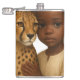 A tender portrait of an African child resting gently against a calm cheetah, capturing a moment of trust, courage and quiet companionship. The soft lighting and clean background highlight the emotional bond between human and animal, creating a story of protection, innocence and wild beauty. Ideal for lovers of cultural or wildlife themes.