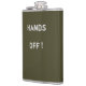Um frasco de bolso elegante em cor khaki simples. Texto moderno em branco esbranquiçado lê "Hands Off". Um presente divertido e ótimo para casamentos, aniversários e ocasiões especiais.