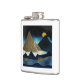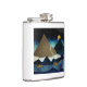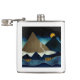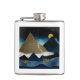 Uma paisagem abstrato com cores e texturas únicas mostrando uma cena de montanha da noite com as luzes brilhantes dos alpinistas e uma lua em tons de azul, ouro, ciano e amarelo.