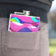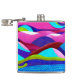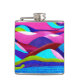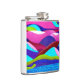Uma paisagem abstrato colorida de colinas e um oceano de cores rosa, roxo, azul, verde e ciano.