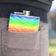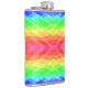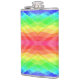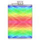 Colorful flask with abstract rainbow pattern of wavy lines in red, orange, yellow, green, and blue. Shiny silver cap on top. Bright and vibrant design.