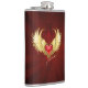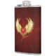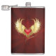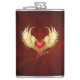 Coração vermelho brilhante de um anjo com asas ouros brilhando no fundo vermelho-radiante escuro decorado com um padrão.