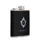 Um desenho elegante preto e prata com o monograma inicial num brasão vintage, recomendado para um homem. O brasão é de falso papel alumínio prateado, o fundo é preto. Abaixo do brasão, em letras maiúsculas pequenas, está o nome em letras maiúsculas cinza.