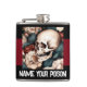 Esse frasco assustador tem um fundo listrado de marrom e preto, com imagem de crânio e flores, na frente. Por baixo da imagem, encontra-se o texto "NAME YOUR POISON".