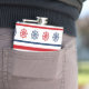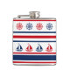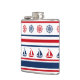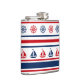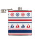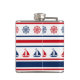Design náutica com barco à vela e decoração de bússolas em fundo listrado vermelho, azul e branco