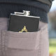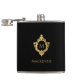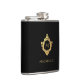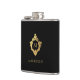 Um design elegante em preto e dourado com o monograma inicial em uma crista vintage, recomendado para um homem. A crista é em folha de ouro falsa, o fundo é preto. Abaixo da crista, em letras maiúsculas pequenas, está o nome em letras douradas.