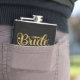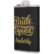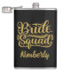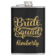 Flask divertido para damas de honra, participantes do chá de noiva e da despedida de solteira, e familiares do lado da noiva, apresenta arte de palavras "Esquadra da Noiva" em dourado sobre fundo preto. Personalize com nome ou monograma em texto de cor correspondente ou exclua a caixa de texto.