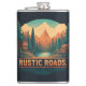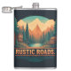 Um design gráfico nostálgico que lembra os jogos clássicos de aventura, com o texto "Estradas Rústicas" em estilo vintage, pixelizado. A paleta de cores evoca um sentido de aventura e exploração, convidando os espectadores a embarcar em uma jornada através de paisagens pixelizadas.
