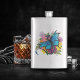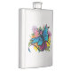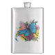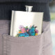 Dragão preto e azul com asas azuis borboletas aninhadas entre um buquê de flores coloridas num pano de fundo azul claro
