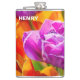 Túlipas violetas, roxas e rosadas coloridas em um canteiro. Praticamente todas as cores do arco-íris presentes. Cena floral brilhante e positiva. Frasco para ele. Personalizável. Você pode alterar ou excluir o nome do modelo Henry.