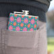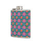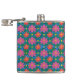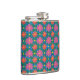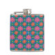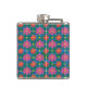 Um bonito frasco da anca embrulhado em vinilo, com um padrão colorido de flores vermelhas e cor-de-rosa e Bolinhas amarelas em um fundo azul e verde profundo. Parte da coleção Posh & Painterly 'Rangoli', este padrão pode ser ajustado para ajustado qualquer Flask.