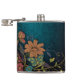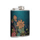 Buquê de flores e borboletas selvagens em cores quentes num fundo azul-escuro floral gravado.