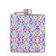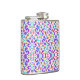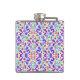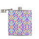 Frasco colorido com padrões intricados florais e geométricos em roxo, azul, verde e laranja. As vistas frontal e lateral destacam o design vibrante.