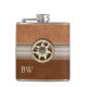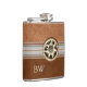 Lindo frasco de beber inspirado na Europa feito em couro marrom claro e escuro, com uma fita passando pelo meio. Uma fotografia de um Edelweiss esculpido em osso decora a parte frontal do frasco. Personalize o monograma de duas letras para você ou como uma ótima ideia de presente.