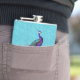 Frasco de senhora elegante feito em um plano de fundo turquesa brilhante, com gráficos de um pavão roxo colorido e pavão teal sentado sobre uma lavanda floresce. Personalize o texto do script roxo para atender às suas necessidades. Faz uma bela ideia de presente.