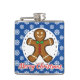 Gingerbread man cookie on a blue white snowflakes pattern background with caption "Merry Christmas".