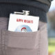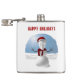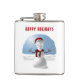 Happy Holidays text which is customizable by you. A funny skull-head snowman wearing a Santa hat and scarf. With a snowy background.